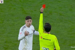 24直播网03月23日讯 西甲第29轮马德里德比,皇马3-2逆转马竞。比赛中皇马中场巴尔韦德背后踢倒巴埃纳吃到直红。