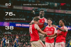 24直播网3月24日讯 阿森纳官方更新社媒动态,晒出球队本赛季50场比赛的战绩。