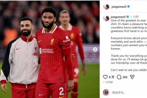 24直播网3月25日讯 萨拉赫本赛季结束后离开利物浦,队友乔·戈麦斯社媒发文致敬。
