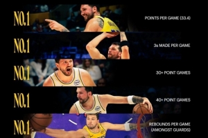 24直播网3月25日讯 今天,湖人官方晒出了东契奇的几项数据记录,并写道:“数据不会说谎。”详情如下: