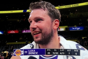 24直播网3月26日讯 NBA常规赛,湖人客场137-130击败步行者,东契奇赛后在场边接受了媒体采访。