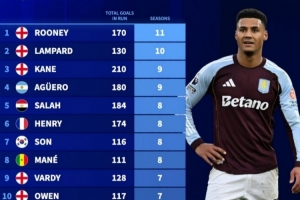 24直播网4月20日讯 维拉前锋沃特金斯本赛季英超进球上双,这已经是他连续第6个赛季做到这一点。德转也盘点了英超历史球员连续进球上双纪录榜,具体如下(期间总进球数+连续上双赛季数):