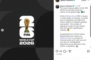 24直播网3月12日讯 国际足联主席因凡蒂诺社媒发文,对即将首次亮相世界杯的国家队表示祝贺。