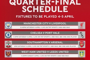 24直播网3月13日讯 足总杯官方公布了1/4决赛的开球时间,曼城vs利物浦4月4日19点45分开球。