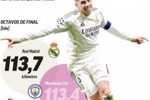 24直播网03月13日讯 欧冠1/8决赛首回合,皇马主场3-0完胜曼城。西班牙媒体《马卡报》撰文,分析了皇马在本场比赛中展现出的跑动能力。