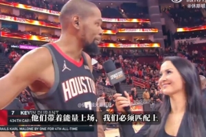 24直播网3月14日讯 NBA常规赛,火箭107-105击败鹈鹕。赛后杜兰特接受记者瓦妮莎的场边采访。