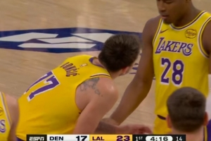 24直播网3月15日讯 NBA常规赛,湖人对阵掘金。比赛中,东契奇保护篮板被八村打到要害。