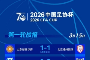 24直播网3月15日讯 2026年足协杯第一轮第三个比赛日结束,北京通州鹏瑞、宁夏平罗恒利、武汉联镇、聊城传奇绿业春、泉州青工走走纺织五支球队晋级。