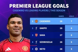 24直播网3月16日讯 英超第30轮比赛,卡塞米罗破门,曼联主场3-1击败维拉。德国转会市场统计了卡塞米罗与部分顶级球员本赛季英超的进球数量。