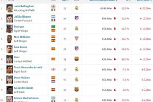 24直播网03月16日讯 德转今日更新西甲身价,贝林、罗德里戈等多名皇马球员身价下跌。