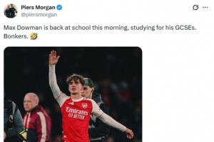 24直播网03月16日讯 今天是周一,英国名嘴、著名阿森纳球迷皮尔斯·摩根社媒发帖,调侃阿森纳16岁小将道曼今天还要去上学。