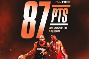 24直播网3月16日讯 近日火箭官方晒出动态显示,杜兰特生涯总得分还差87分就将超越历史第五的乔丹。