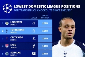 24直播网3月10日讯 德国转会市场统计了欧冠改制以来淘汰赛球队的联赛排名,并列出联赛排名最低欧冠淘汰赛球队榜单,本赛季热刺排名仅高于2016-2017赛季的莱斯特城。