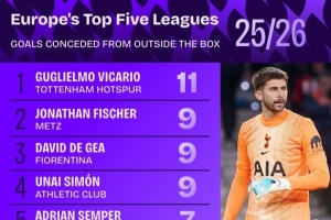 24直播网3月17日讯 Squawka统计了本赛季门将在五大联赛禁区外失球的数量,并列出榜单,维卡里奥11球最多。
