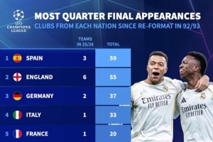 24直播网3月17日讯 德国转会市场统计了1992-1993赛季欧冠改制以来各国球队晋级8强的次数,并列出榜单,西班牙59次最多,英格兰55次第二。