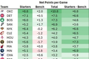 24直播网3月17日讯 今天,数据分析师Dean Oliver统计了本赛季联盟各队首发阵容和替补阵容的净效率(百回合净胜分)。