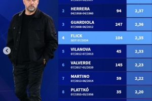 24直播网3月17日讯 德国转会市场盘点了巴萨历任主教练场均拿分情况(至少执教15场比赛),弗里克以2.35分位居第4,仅次于恩里克、埃雷拉和瓜迪奥拉。
