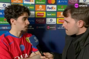 24直播网3月18日讯 欧冠1/8决赛次回合,巴黎客场3比0击败切尔西,总比分8比2大胜晋级8强。赛后,巴黎中场维蒂尼亚接受了TNT体育的采访。