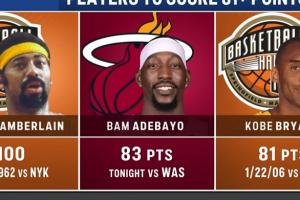 24直播网03月11日讯 NBA常规赛,热火150-129击败奇才。阿德巴约单场砍下83分,超越科比NBA历史第2。